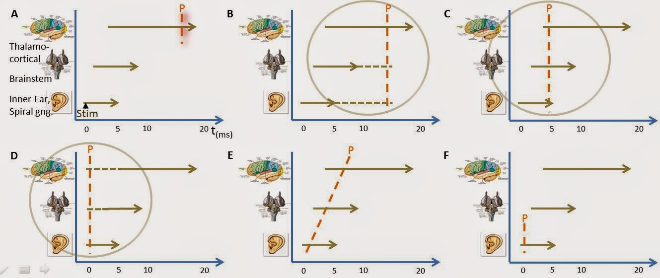 To apply to auditory signals in larger mammals, it seems the virtual focal point anchor of conscious experience would have to be relegated to brainstem, diencephallic or low forebrain structures (i.e. some combination of models [C] and [E] in the synchronicity based consciousness mediating models illustration; ref. above re temporal binding in the timescale of a conscious moment). - A temporally extended model would see the conscious percept